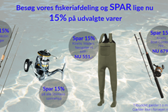 I hele oktober har vi 15% på udvalgte varer i fiskeriafdelingen. Bl.a. opnår du 15% på stænger til kystfiskeri og havfiskeri.